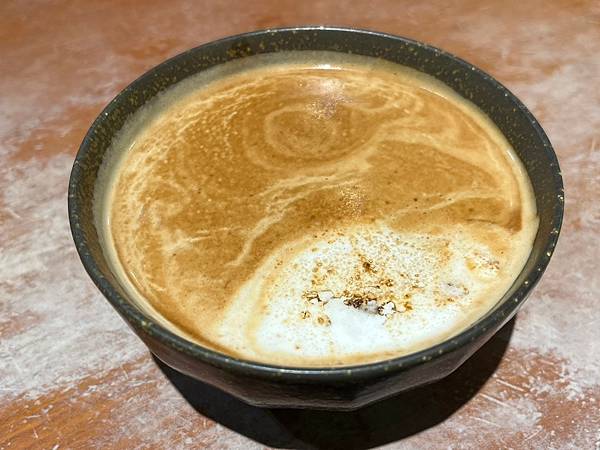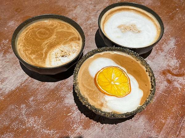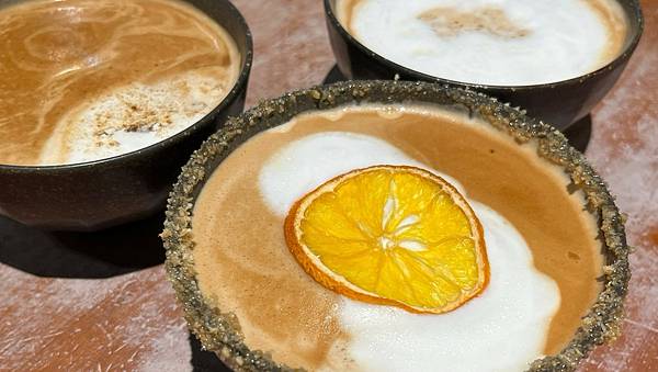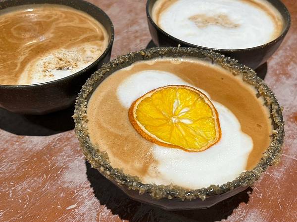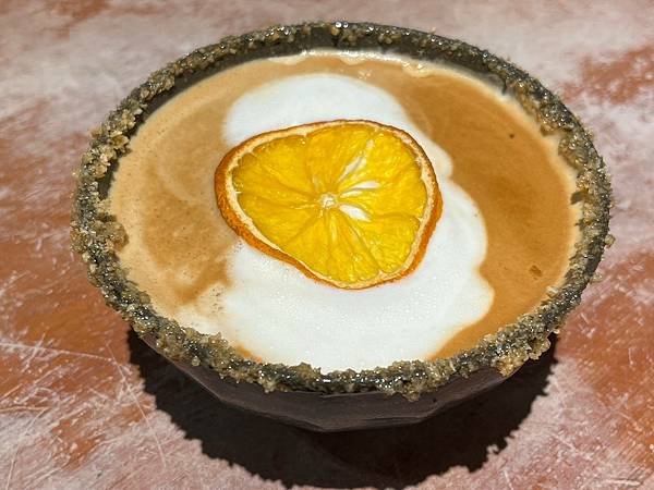 福來許珈琲館的招牌「陳香拿鐵」,採中式碗裝呈現,碗緣灑滿細緻的迪化街特產的陳皮糖粉,搭配一片明亮的橙片,超美的!!!